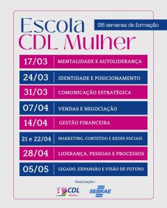 A CDL Mulher, em parceria com o Sebrae, inicia nesta terça-feira, 17 de março, em Anápolis, a Escola CDL Mulher, um programa de formação gratuito voltado ao desenvolvimento de mulheres empreendedoras, gestoras e profissionais que desejam fortalecer seus negócios.